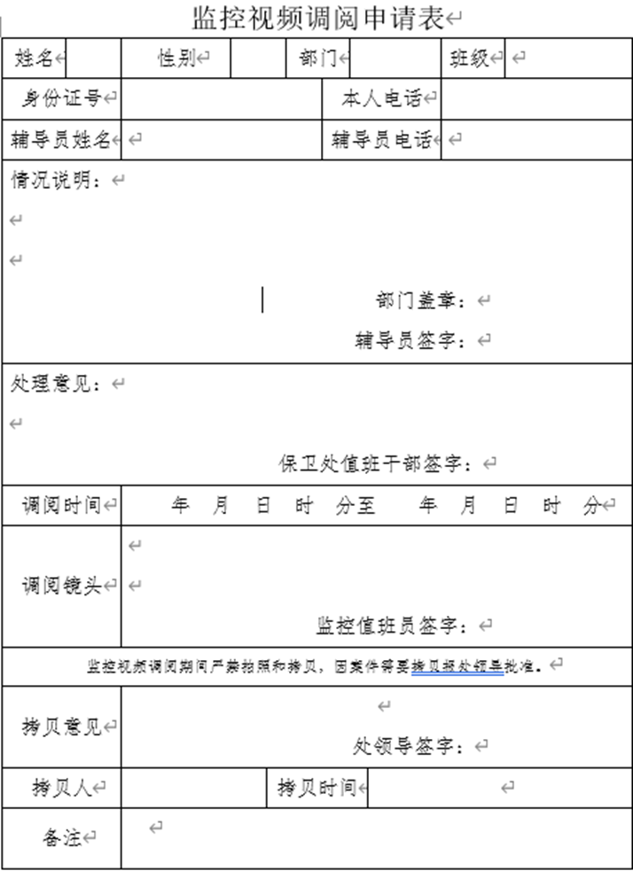 1、调阅人点击附件下载《监控视频调阅申请表》,打印在一张A4纸的正反两面,填写表格前四行,由辅导员签字,部门领导审核后加盖部门公章。