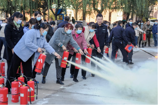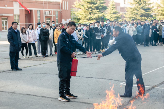 保卫处消防专干孙伟同志对火灾的预防常识、逃生方法以及对普通火灾、危化品爆燃等不同类型火灾的灭火要点进行了讲解。保卫处工作人员带领师生、公寓管理员、食堂工作人员们亲自上手学习了灭火器材的使用并进行实战操作。