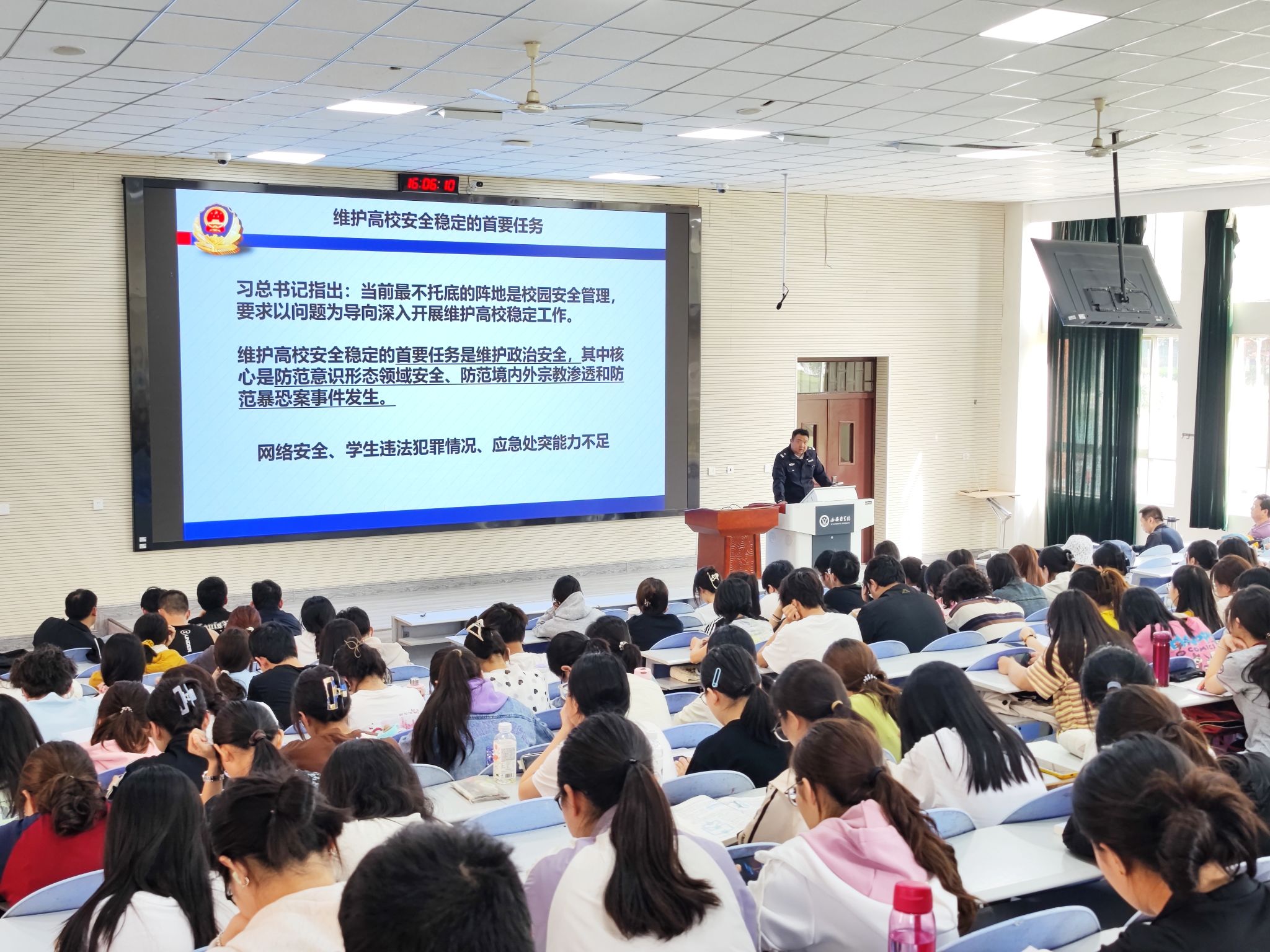 下半场,由西安市公安局反恐支队副大队长王保人以“共筑反恐防线,守护美好校园”为题,带领全体师生深入了解了恐怖主义的起源及危害,剖析了“三股势力”的背景知识、具体含义及内部逻辑,强调了反恐工作与高校之间的重要联系。他呼吁全体师生要树立正确的世界观、人生观、价值观,坚决抵御各类渗透行为,以实际行动筑牢国家安全的铜墙铁壁。