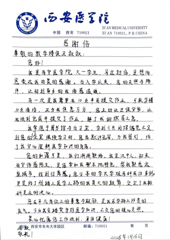 这封朴实的感谢信,不仅是对西医安保人员们默默付出的高度认可,更是学校“平安校园”建设与服务育人工作中鲜活生动的温情注脚。从点滴善意到系统创新,保卫处用专业与坚守筑牢安全屏障,用温情与担当践行育人使命,这份来自学子的肯定,对全体安保人员而言,既是一份荣誉,更是一份砥砺前行的动力。